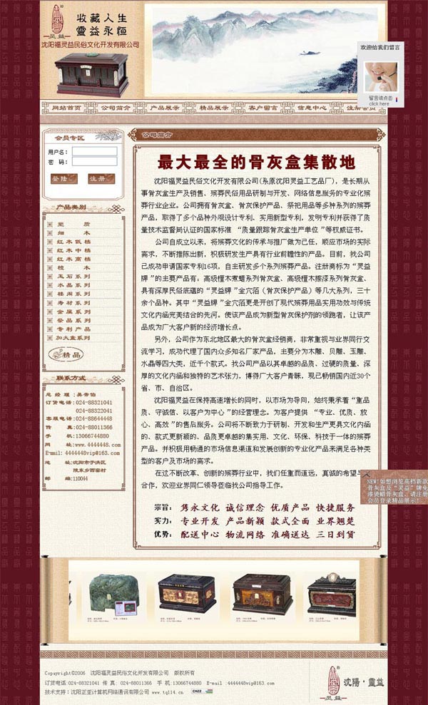 沈陽(yáng)福靈益民俗文化開發(fā)有限公司(系原沈陽(yáng)靈益工藝品廠),是長(zhǎng)期從事骨灰盒生產(chǎn)及銷售、殯葬民俗用品研制與開發(fā)、網(wǎng)絡(luò)信息服務(wù)的專業(yè)化殯葬行業(yè)企業(yè)。公司擁有骨灰盒、骨灰保護(hù)產(chǎn)品、祭祀用品等多種系列的殯葬產(chǎn)品,取得了多個(gè)品種外觀設(shè)計(jì)專利、實(shí)用新型專利,發(fā)明專利并獲得了質(zhì)量技術(shù)監(jiān)督局認(rèn)證的國(guó)家標(biāo)準(zhǔn) “質(zhì)量跟蹤骨灰盒生產(chǎn)單位”等權(quán)威證書。
